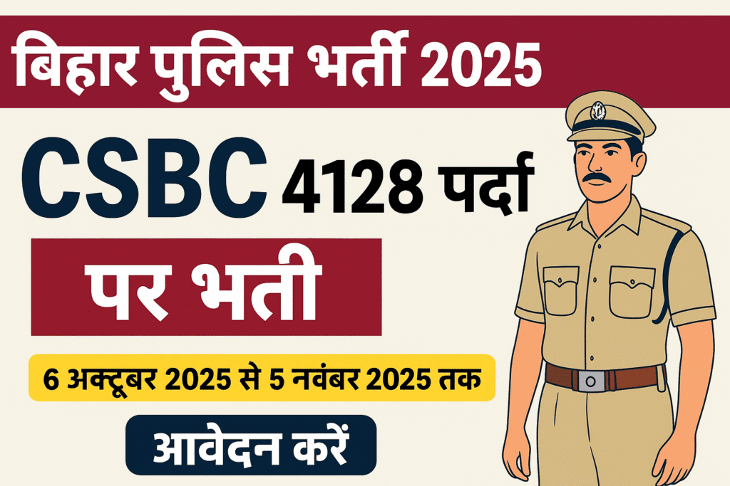 Patna: केंद्रीय चयन पर्षद (CSBC) द्वारा बिहार पुलिस कॉन्स्टेबल भर्ती निकली गयी हैं। यह युवाओं के लिए बड़ी खुशखबरी है। सिपाही के कुल भर्ती 4128 पदों पर निकली गयी है। इसमें Prohibition Constable, Jail Warder और Mobile Squad Constable जैसे अलग-अलग भर्ती शामिल हैं। इसकी आवेदन 6 अक्टूबर 2025 से 5 नवंबर 2025 तक चलेगी। इच्छुक उम्मीदवार आधिकारिक वेबसाइट csbc.bihar.gov.in पर जाकर ऑनलाइन आवेदन कर सकते हैं।
